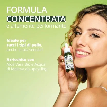 Siero viso concentrato certificato biologico formulato da Acido Salicilico, una molecola dotata di proprietà esfolianti che si rivela particolarmente utile in caso di acne o pelle impura.
