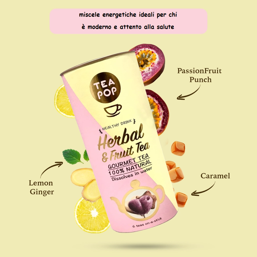 Tea-Pop è un estratto naturale al 100% di foglie di tè, frutti, piante ed erbe, cristallizzato in una nuova forma e completamente sciolto in acqua per un'esperienza di tè gourmet.