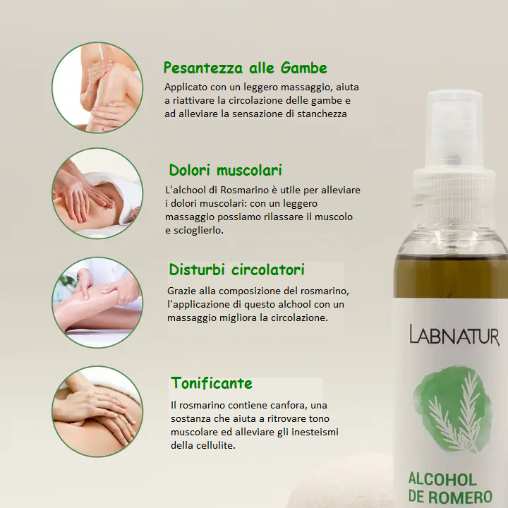 Pesantezza delle gambe: questo preparato applicato con un leggero massaggio aiuta a riattivare la circolazione delle gambe e a migliorare la sensazione di stanchezza nelle gambe. Grazie alla composizione del rosmarino l'applicazione di questo alcool massaggiando migliora la circolazione.