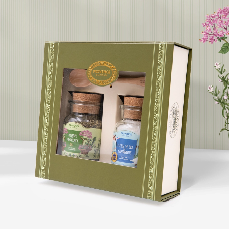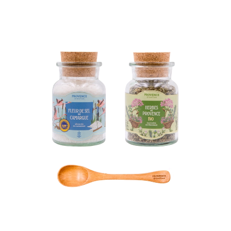 Un cofanetto eccezionale che unisce la finezza del Fleur de Sel de Camargue IGP, raccolto a mano sotto il sole e il maestrale, e i profumi avvolgenti delle Erbe di Provenza BIO: timo, rosmarino, origano, santoreggia.