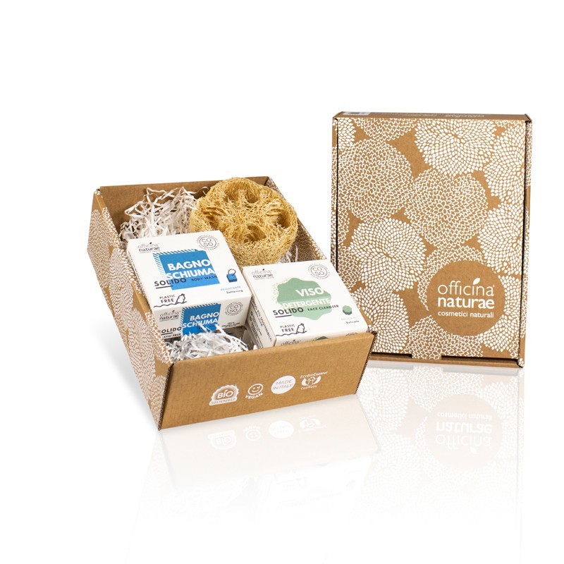 Confezione regalo composta da una graziosa scatola decorata, riutilizzabile e riciclabile, con due prodotti solidi e un pratico accessorio per lavare dolcemente viso e corpo.