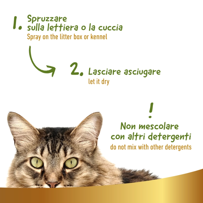 Per ottenere la massima resa del prodotto con le lettiere, spruzzare uniformemente sia sul fondo della vaschetta prima di versare la sabbia, sia sulla sabbia già distesa. Lasciare asciugare. In seguito, spruzzare uniformemente sull'intera superficie della lettiera, oppure solo sulle zone utilizzate dal gatto.