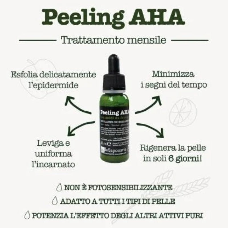 Il nostro peeling AHA esfolia la pelle andando a scindere i legami tra le cellule morte, ma non solo! Grazie al suo contenuto di alfa-idrossiacidi, fenoli naturali e polisaccaridi: