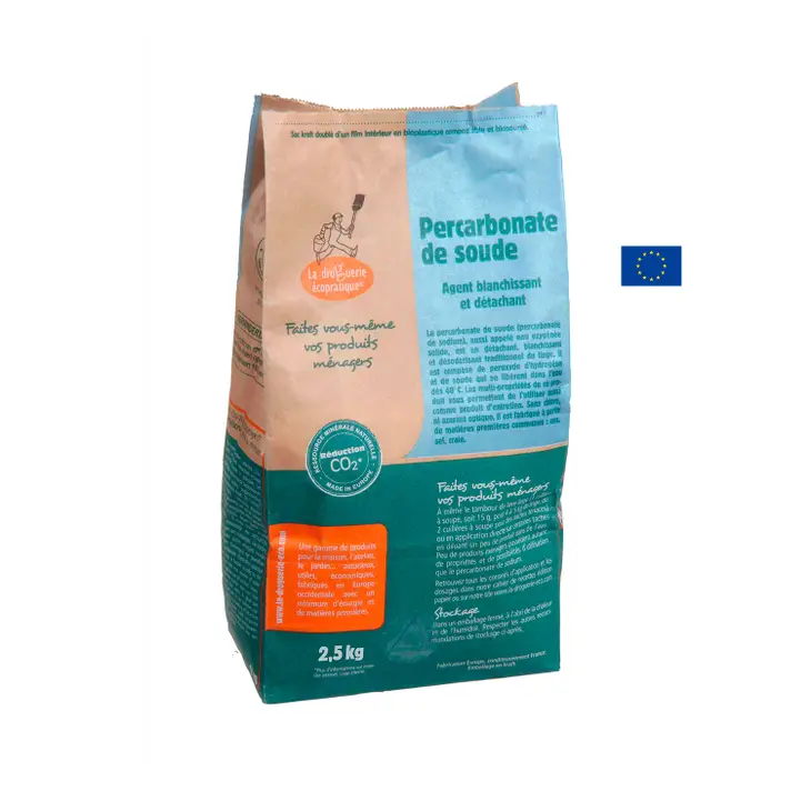 È composto da perossido di idrogeno e soda, che vengono rilasciati in acqua a 40°C. Potente detergente e sgrassante, il percarbonato è anche un prodotto detergente multiuso. Senza cloro o sbiancanti ottici.