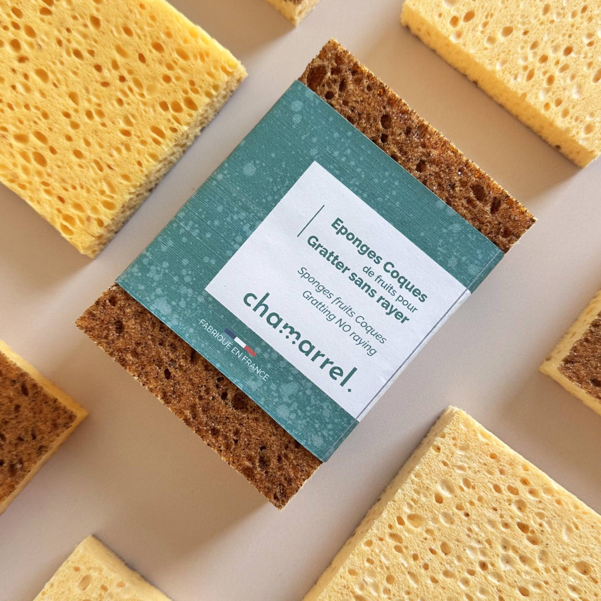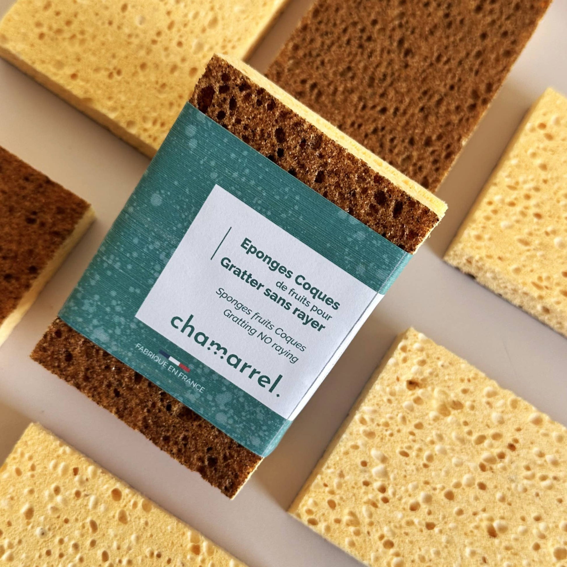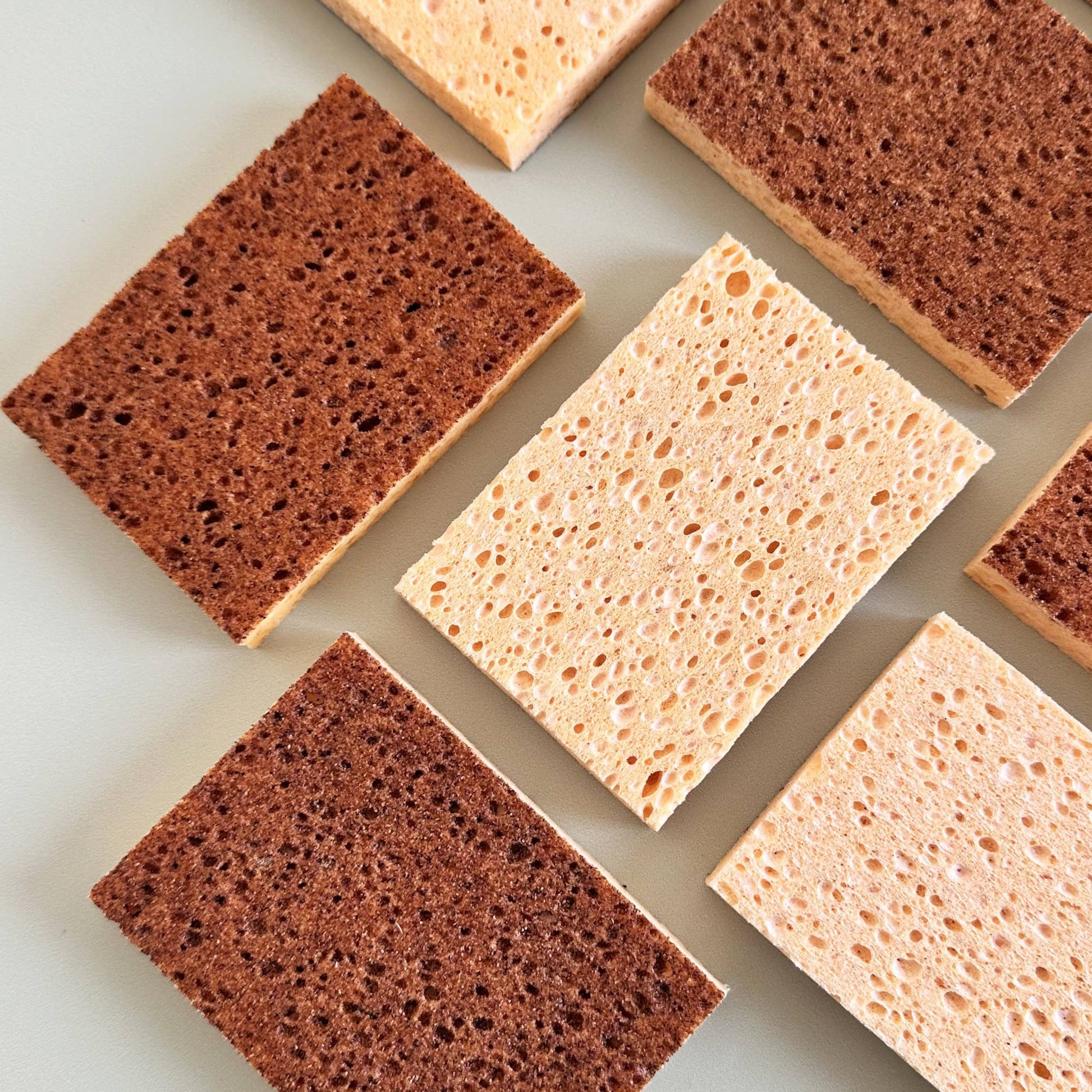 Composizione & progettazione Spugna (corpo): cellulosa (pasta di legno + cellulosa naturale). Parte abrasiva: polvere di bucce dure e noccioli di frutta (pino, mandorla, noce), termoadesivata senza colla né additivi.